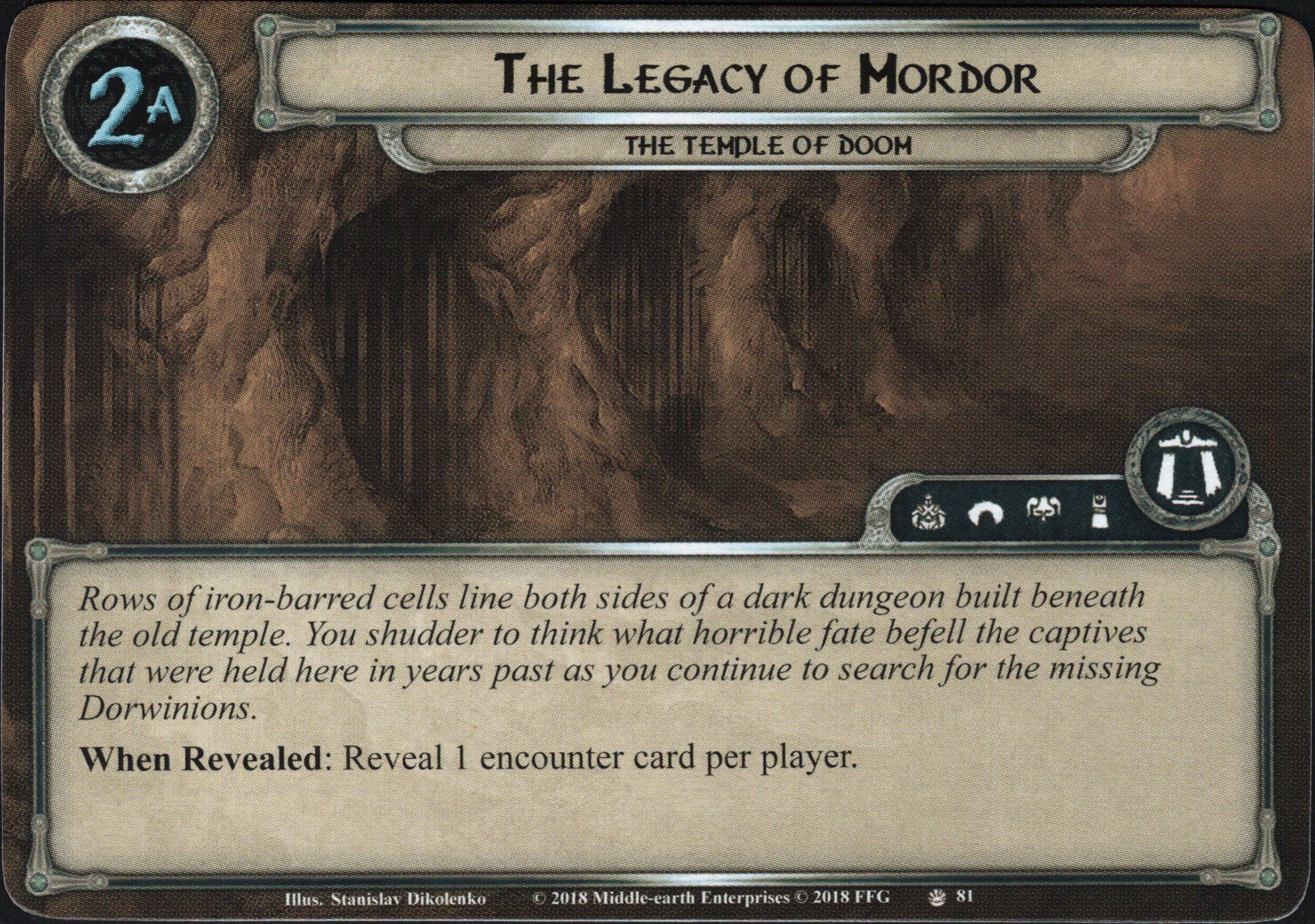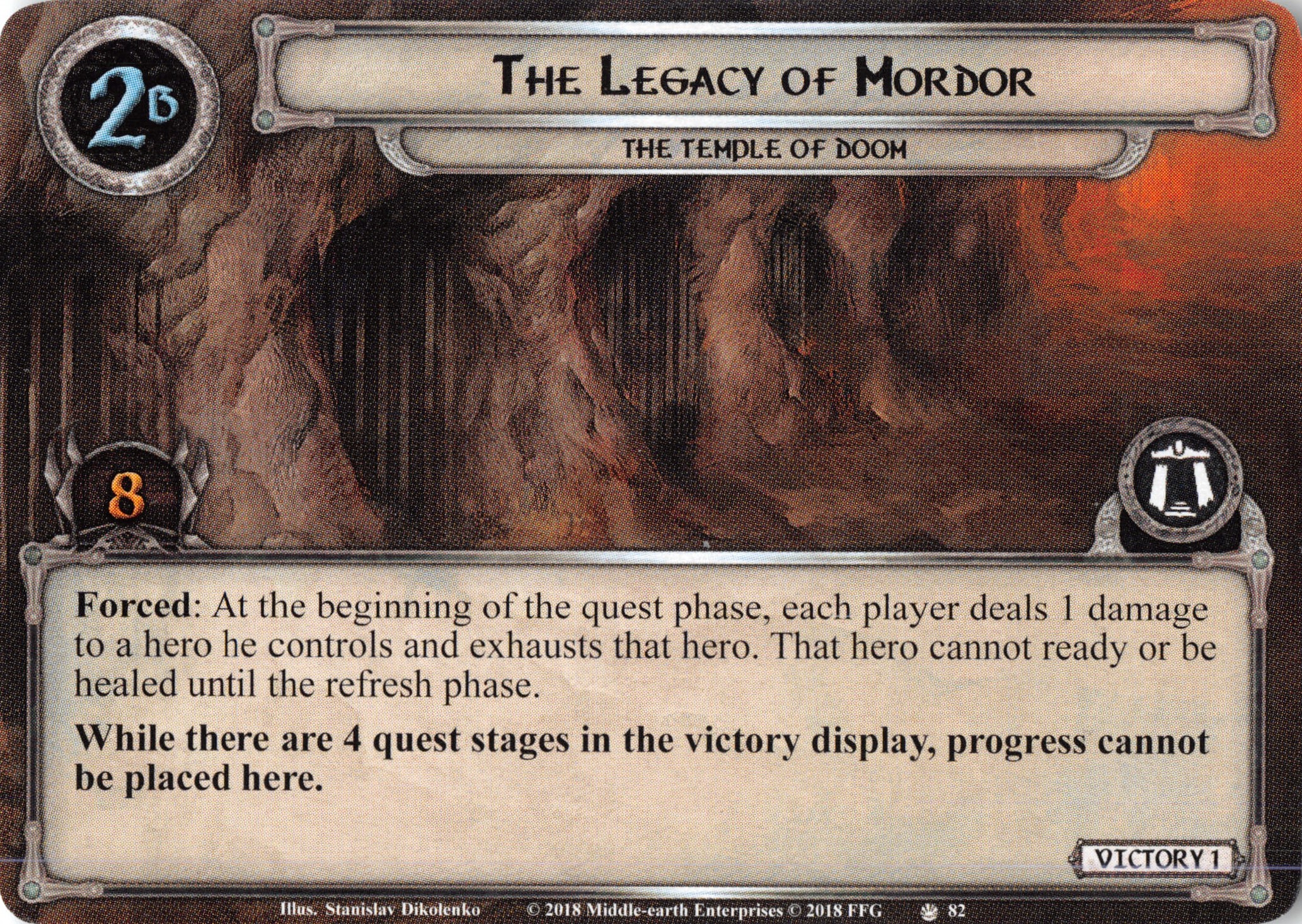 Forced: At the beginning of the quest phase, each player deals 1 damage to a hero he controls and exhausts that hero. That hero cannot ready or be healed until the refresh phase.