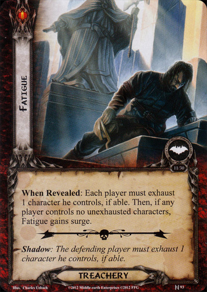 When Revealed: Each player must exhaust 1 character he controls, if able. Then, if any player controls no unexhausted characters, Fatigue gains Surge.