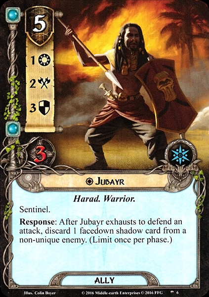 Response: After Jubayr exhausts to defend an attack, discard 1 facedown shadow card from a non-unique enemy. (Limit once per phase.)