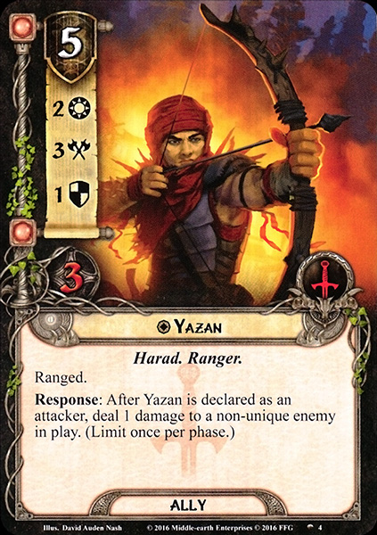 Response: After Yazan is declared as an attacker, deal 1 damage to a non-unique enemy in play. (Limit once per phase.)