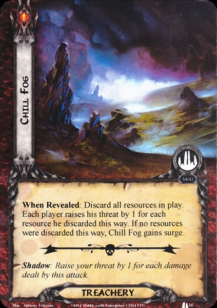 When Revealed: Discard all resources in play. Each player raises his threat by 1 for each resource he discarded this way. If no resources were discarded this way, Chill Fog gains surge.