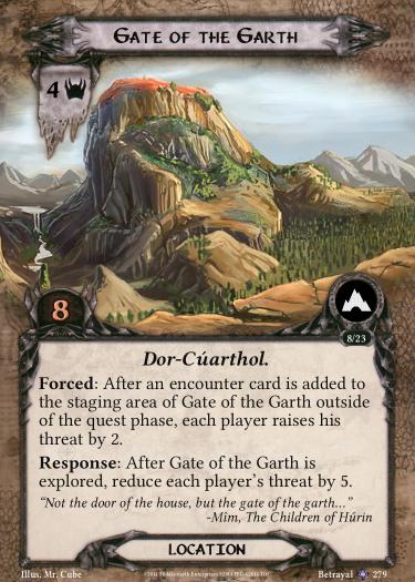 Forced: After an encounter card is added to the staging area of Gate of the Garth outside of the quest phase, each player raises he threat by 2.