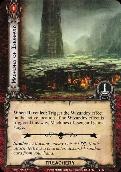 When Revealed: Trigger the Wizardry effect on the active location. If no Wizardry effect is triggered this way, Machines of Isengard gains surge.