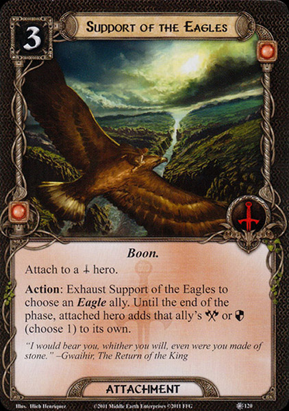 Action: Exhaust Support of the Eagles to choose an Eagle ally. Until the end of the phase, attached hero adds that ally's Attack or Defense (choose 1) to its own.