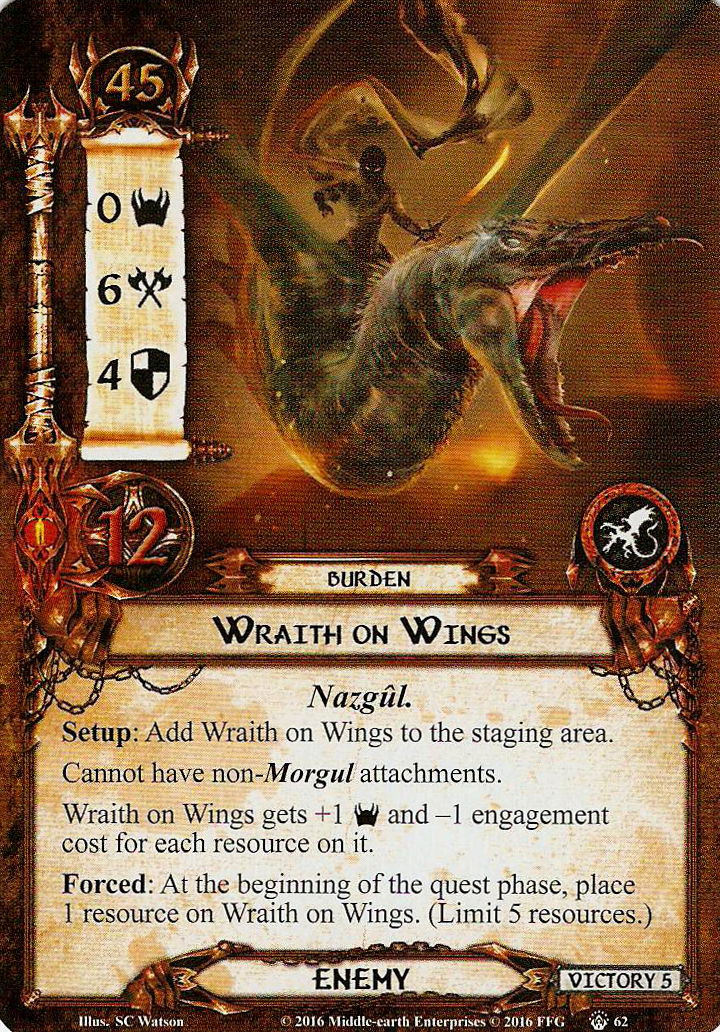 Forced: At the beginning of the quest phase, place 1 resource on Wraith on Wings (Limit 5 resources.)