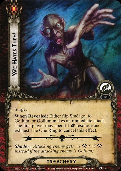 *Forced: After Gollum is discarded during a Fortitude test, put him into play engaged with the first player. Then, choose an encounter card discarded from this test and ignore its  icons.