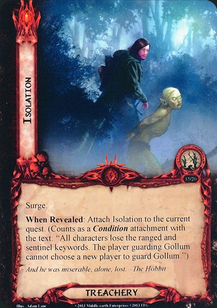*Forced: After Gollum is discarded during a Fortitude test, put him into play engaged with the first player. Then, choose an encounter card discarded from this test and ignore its  icons.