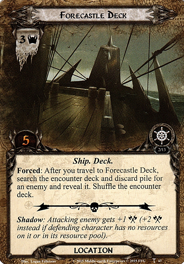 Forced: After you travel to Forecastle Deck, search the encounter deck and discard pile for an enemy and reveal it. Shuffle the encounter deck.