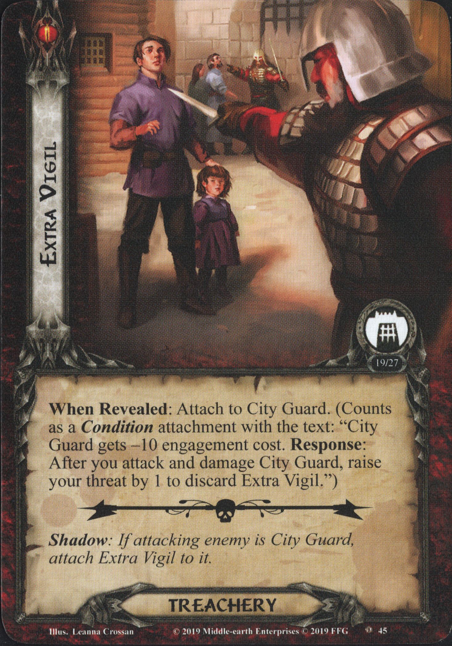 When Revealed: Attach to City Guard. (Counts as a Condition attachment with the text: "City Guard gets -10 engagement cost.Response: After you attack and damage City Guard, raise your threat by 1 and discard Extra Vigil.")