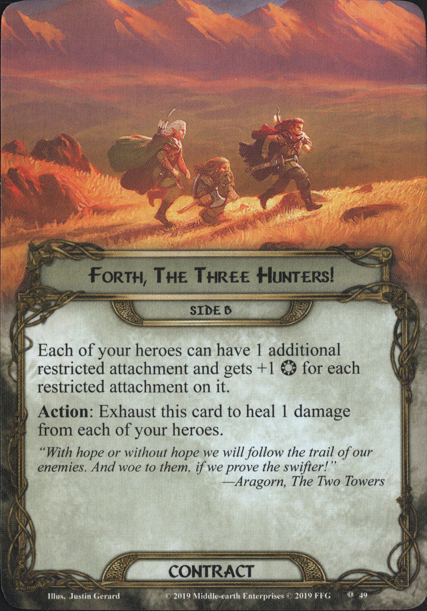 Refresh Action: If each of your heroes has at least 2 restricted attachments, flip this card over.