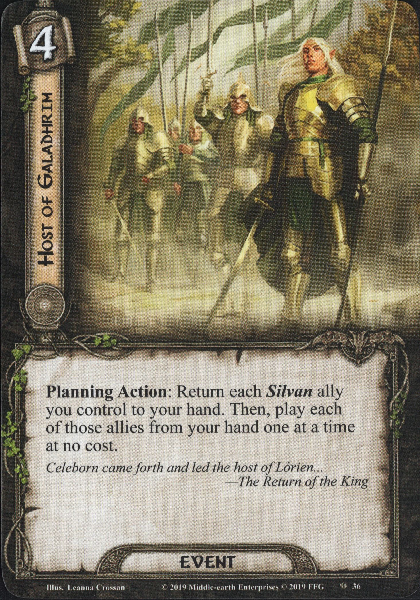 Response: After Lothíriel commits to a quest, choose an ally in your hand. If that ally shares a Trait with her, put that ally into play exhausted and committed to the quest. At the end of the phase, if that ally is still in play, shuffle it into your deck.