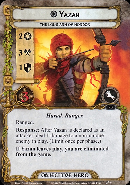 Response: After Yazan is declared as an attacker, deal 1 damage to a non-unique enemy in play. (Limit once per phase.)
