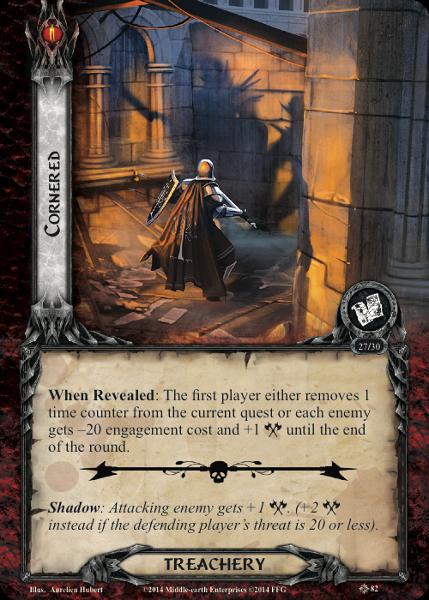 When Revealed: The first player either removes 1 time counter from the current quest or each enemies gets -20 engagement cost and +1 Attack until the end of the round.