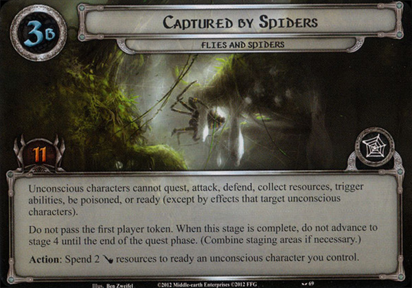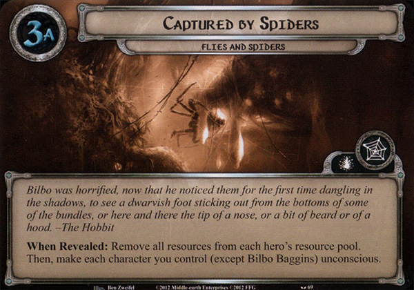 When Revealed: Remove all resources from each hero's resource pool. Then, make each character you control (except Bilbo Baggins) unconscious.