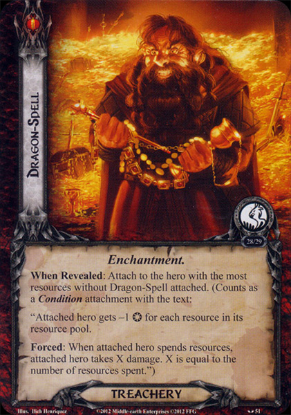 When Revealed: Attach to the hero with the most resources without Dragon-Spell attached. (Counts as a Condition attachment with the text: