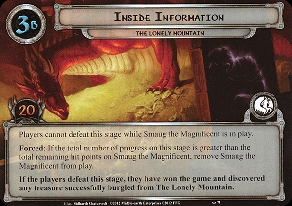 Forced: If the total number of progress on this stage is greater than the total remaining hit points on Smaug the Magnificent, remove Smaug the Magnificent from play.