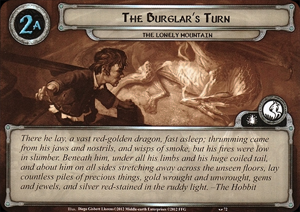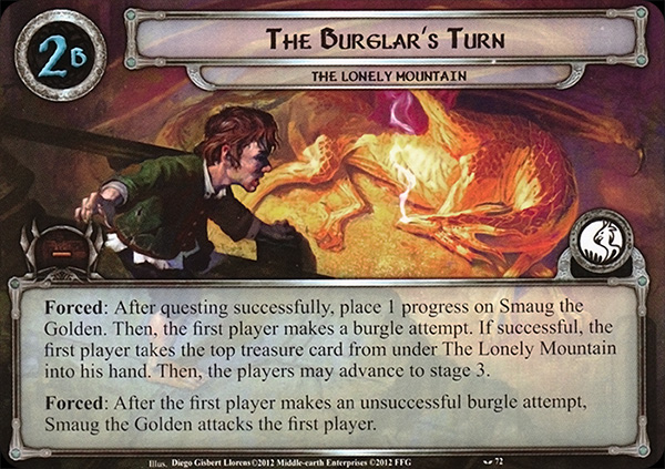 Forced: After questing successfully, place 1 progress on Smaug the Golden. Then, he first player makes a burgle attempt. If successful, the first player takes the top card from under The Lonely Mountain into his hand. Then, the players may advance to stage 3.
