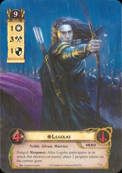 Response: After Legolas participates in an attack that destroys an enemy, draw 1 card.