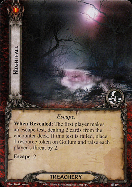 Forced: At the end of the quest phase, the party must make an escape test, dealing 1 card per player from the encounter deck. If this test is failed, place 2 resource tokens on Gollum.